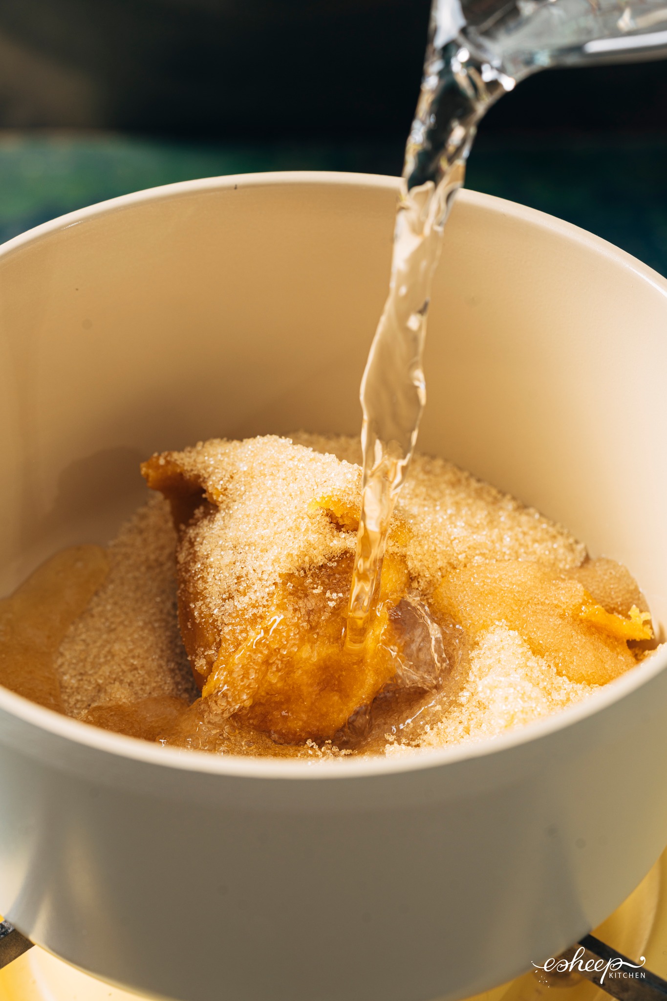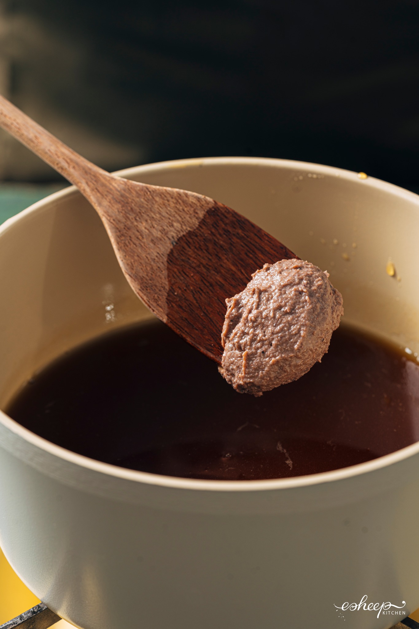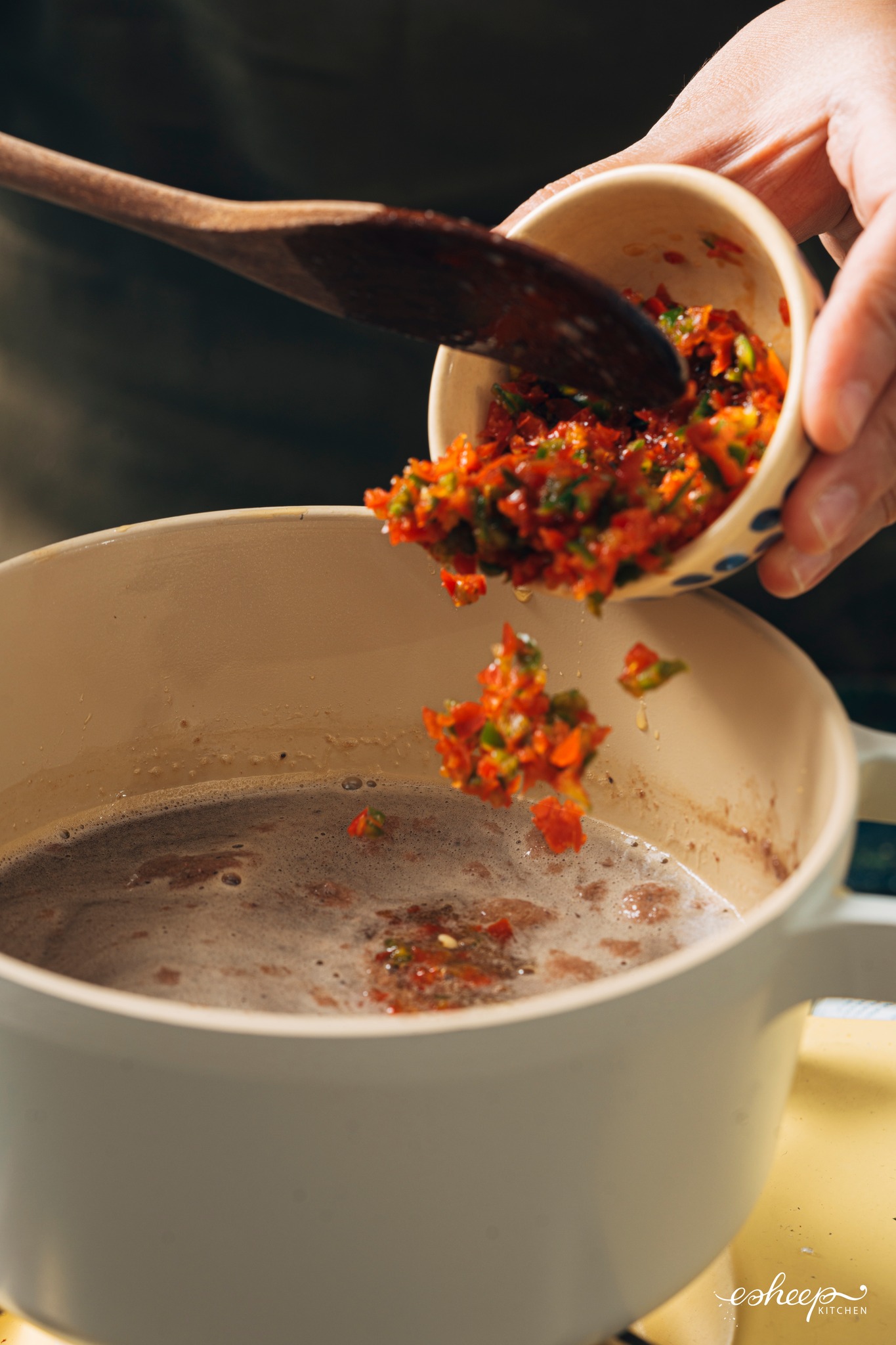 Cho mắm (ruốc) vào nồi… (nước) mắm đường, khuấy cho tan nè.