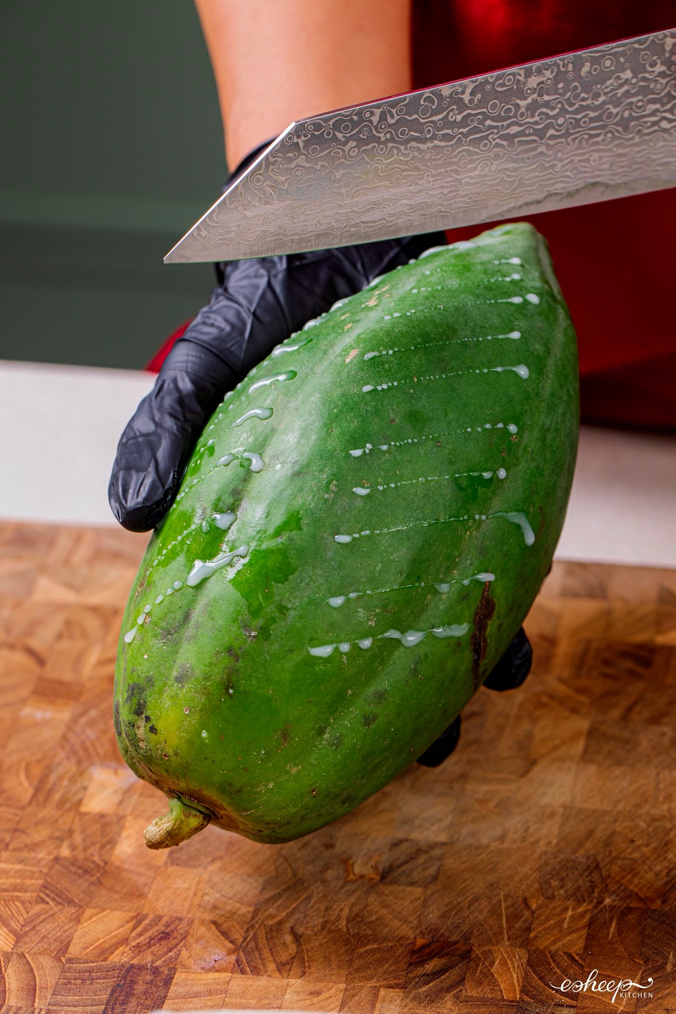 Băm chéo trên vỏ quả cho nhựa sẽ chảy ra hết giúp nhựa thoát ra, khử vị đắng và mùi nồng của đu đủ khi nấu.
