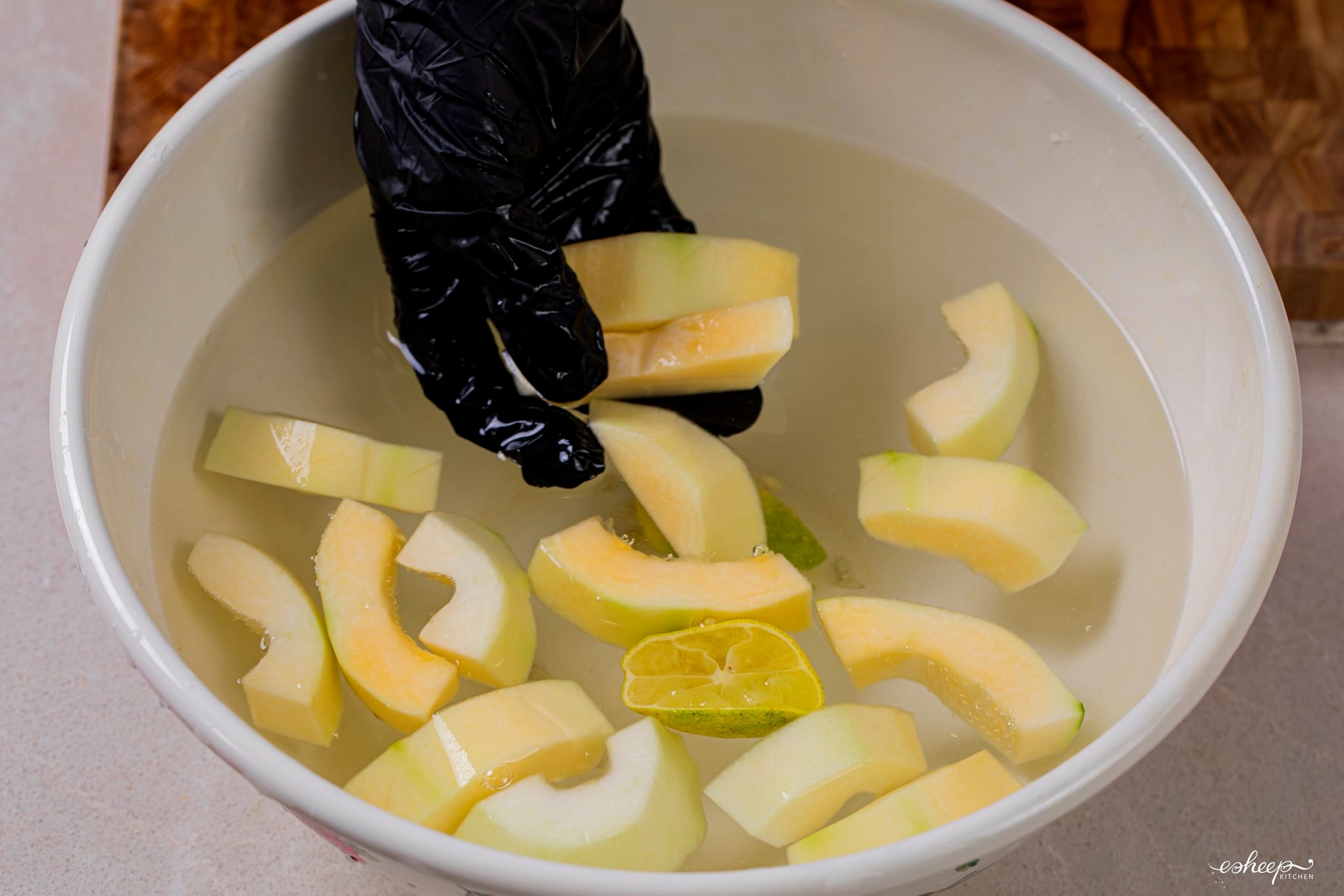 Đu đủ xanh bỏ vỏ, cắt miếng, ngâm nước chanh sẽ rất trắng, không bị thâm xỉn. Cho bạn nào chưa biết thì đu đủ bung cũng là một nét đặc sắc, khác biệt của bún bung Hà Nội đấy