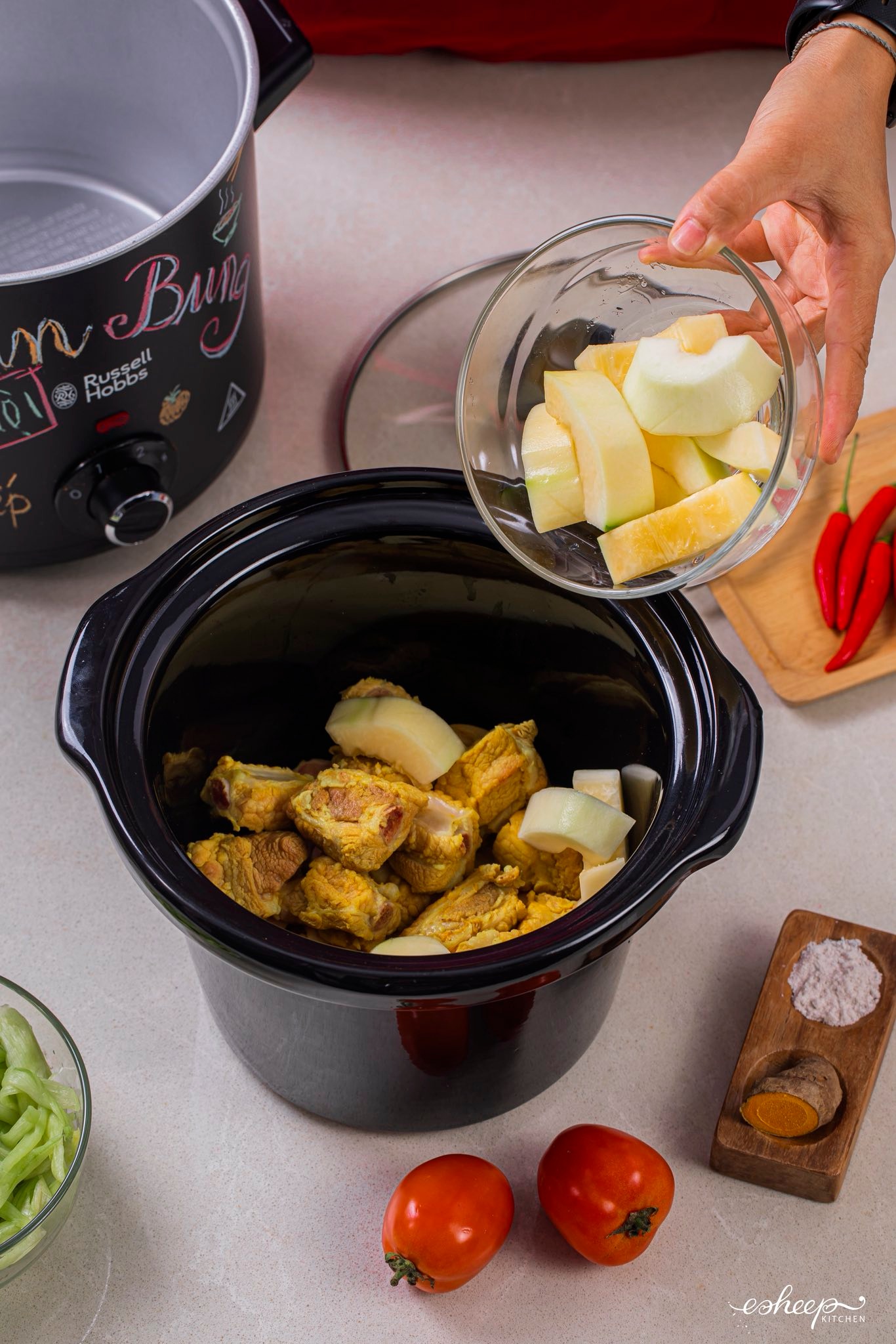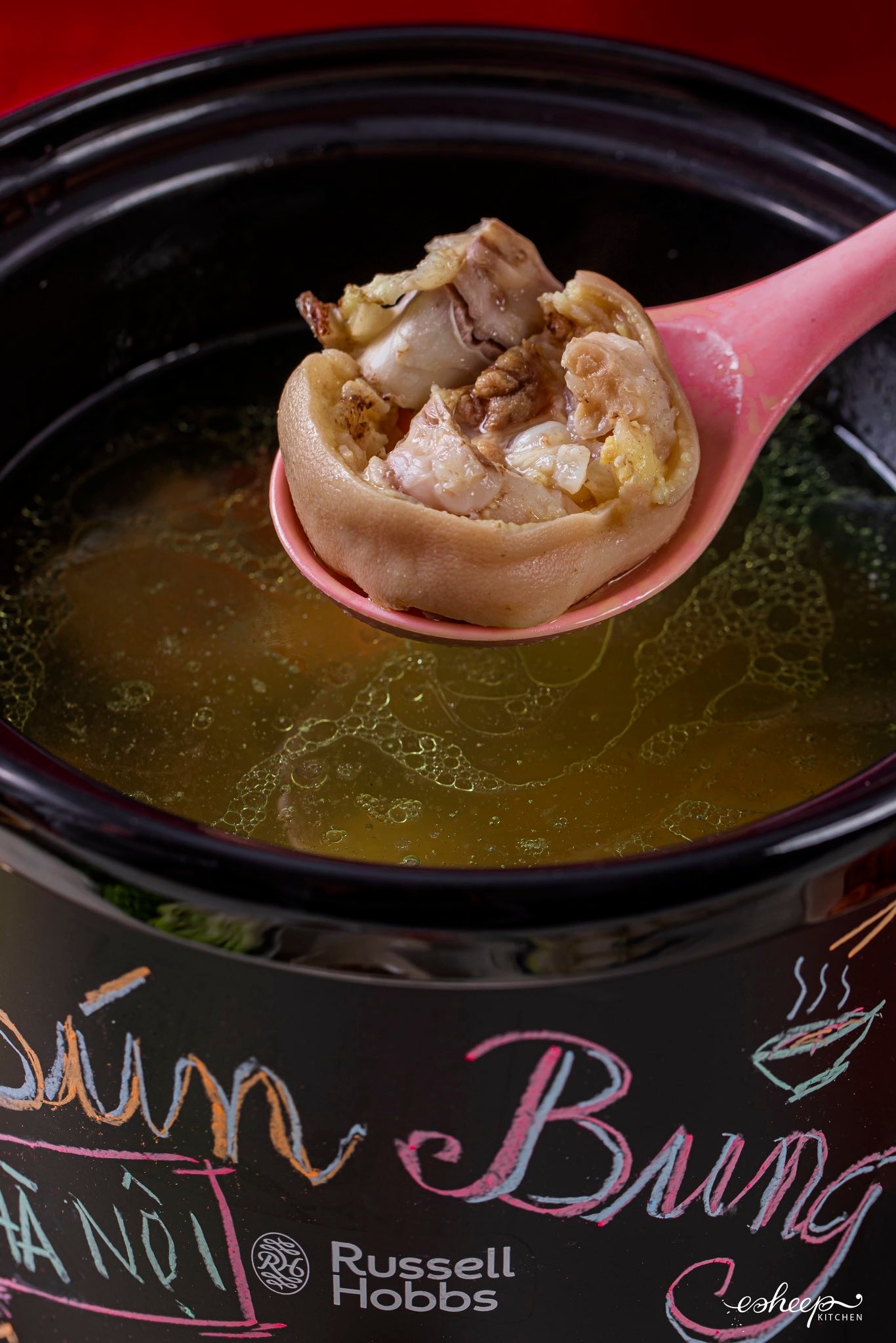 Gọi là kỹ thuật cho oách, chứ nấu bung chỉ cần cho hết móng giò, sườn, đu đủ xanh vào nồi bung thôi các bạn ạ Lý do mà mình siêu thích em nồi nấu chậm Russell Hobb này là thiết kế đơn giản nhưng hiệu quả, hợp mọi không gian bếp. Thân cứng cáp, lòng nồi gốm an toàn cho sức khỏe, đạt tiêu chuẩn LFGB (Đức), FDA(Mỹ), thành nồi khá cao nên nguyên liệu luôn được nấu ngập nước, đảo khuấy rất đã tay, không bị bắn.