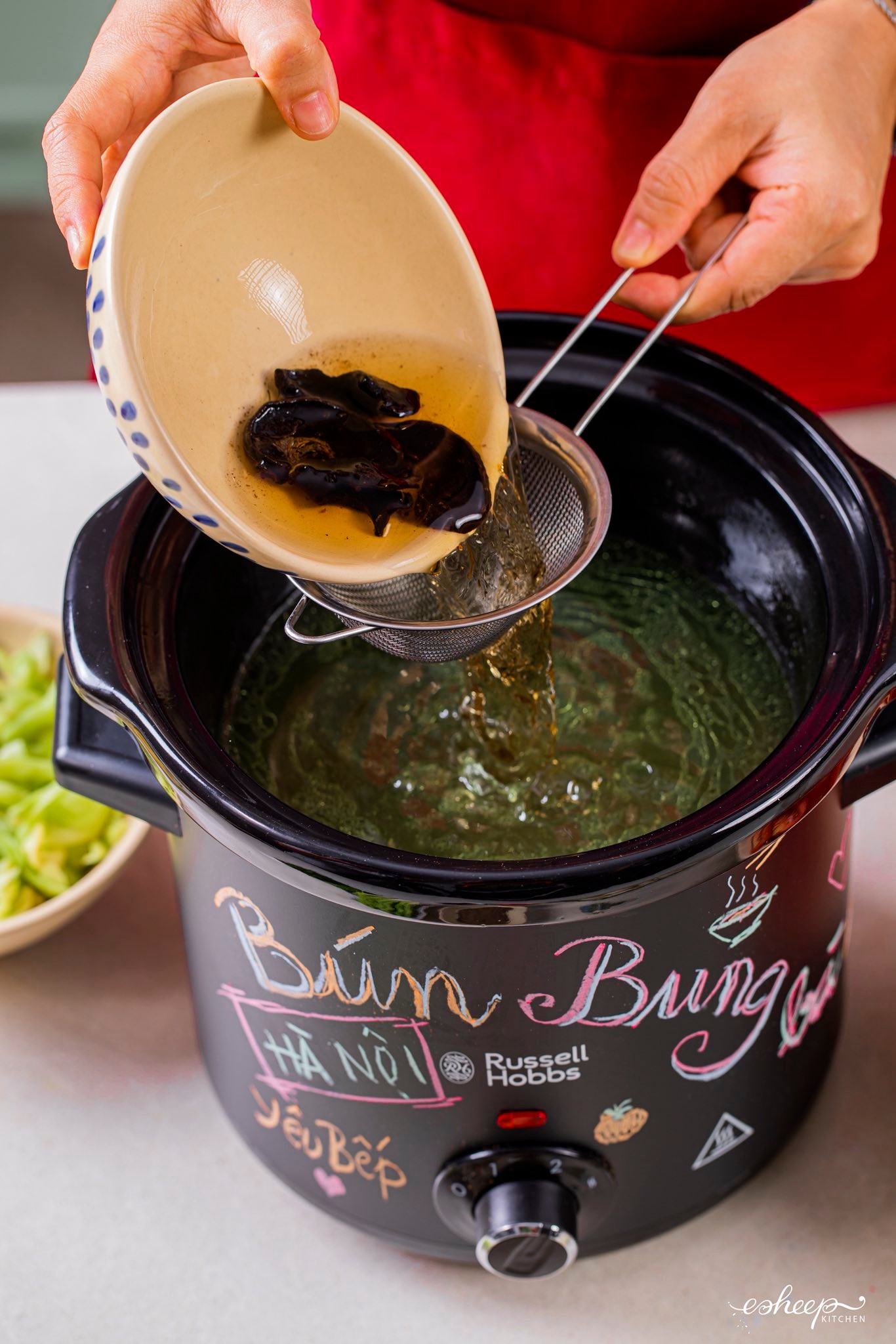 Bày cả bát bún, và em nồi nấu chậm Russell Hobb để các bạn hình dung được sự nhỏ gọn của em nó nhé. Ai thích khoe nồi xịn như mình thì cứ để cả nồi ở góc bàn ăn, chọn chế độ GIỮ ẤM, ăn hết đến đâu lại múc đến đó.Mà nấu xong lau sạch sẽ, cất gọn trên kệ hoặc tủ bếp vô tư
