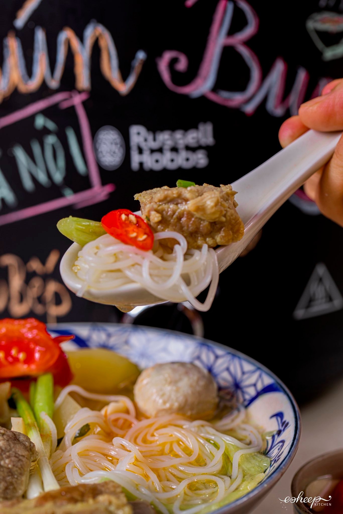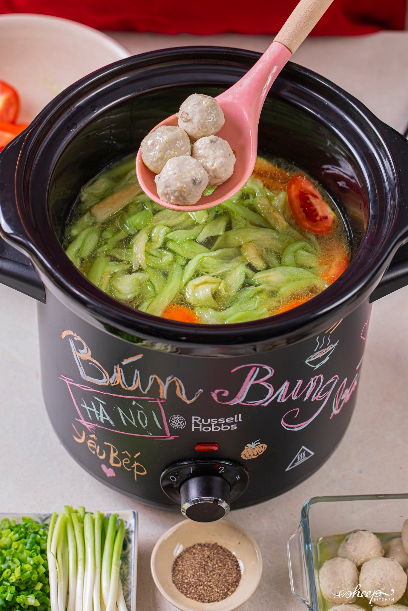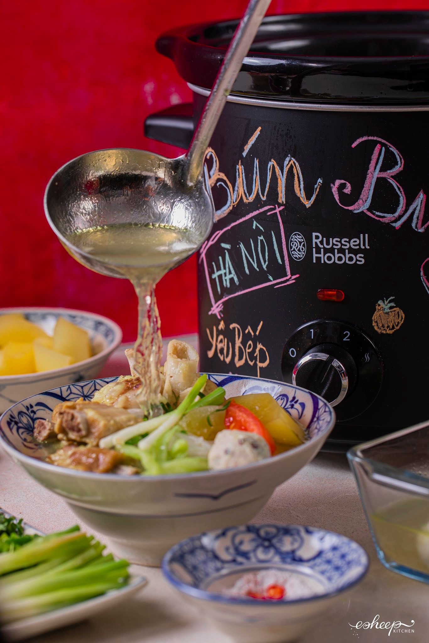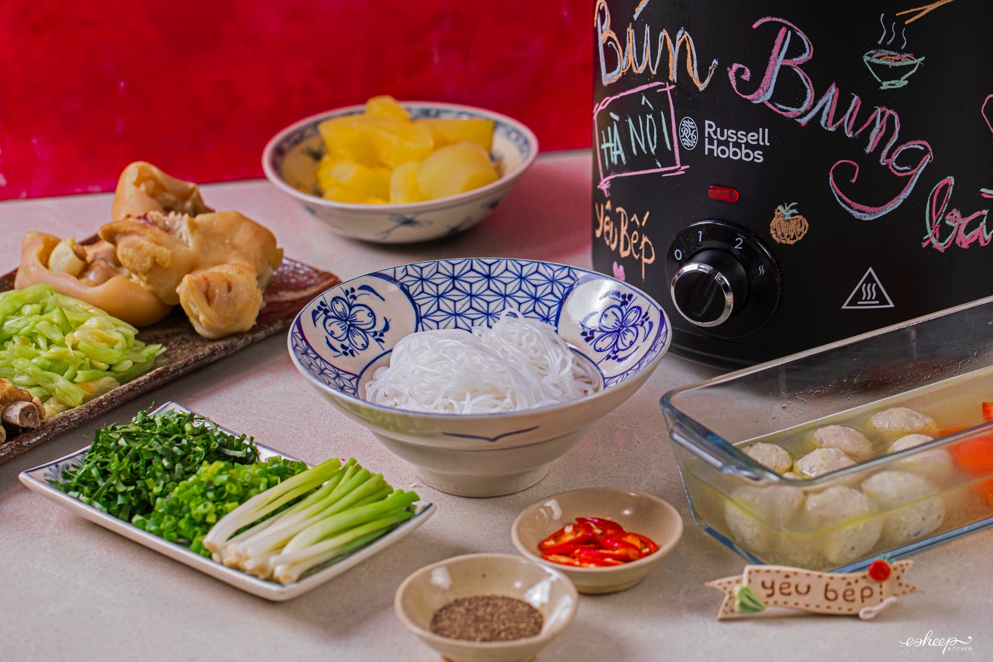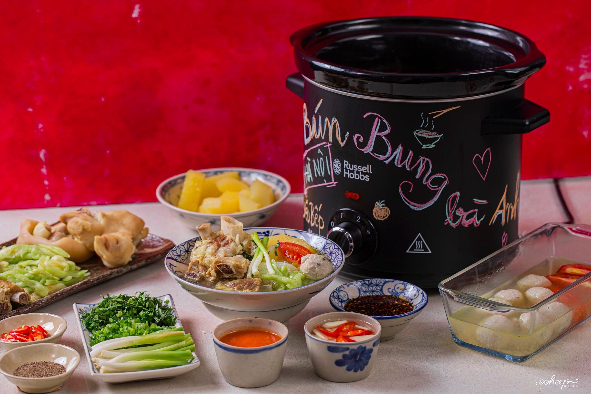 Bày cả bát bún, và em nồi nấu chậm Russell Hobb để các bạn hình dung được sự nhỏ gọn của em nó nhé. Ai thích khoe nồi xịn như mình thì cứ để cả nồi ở góc bàn ăn, chọn chế độ GIỮ ẤM, ăn hết đến đâu lại múc đến đó.