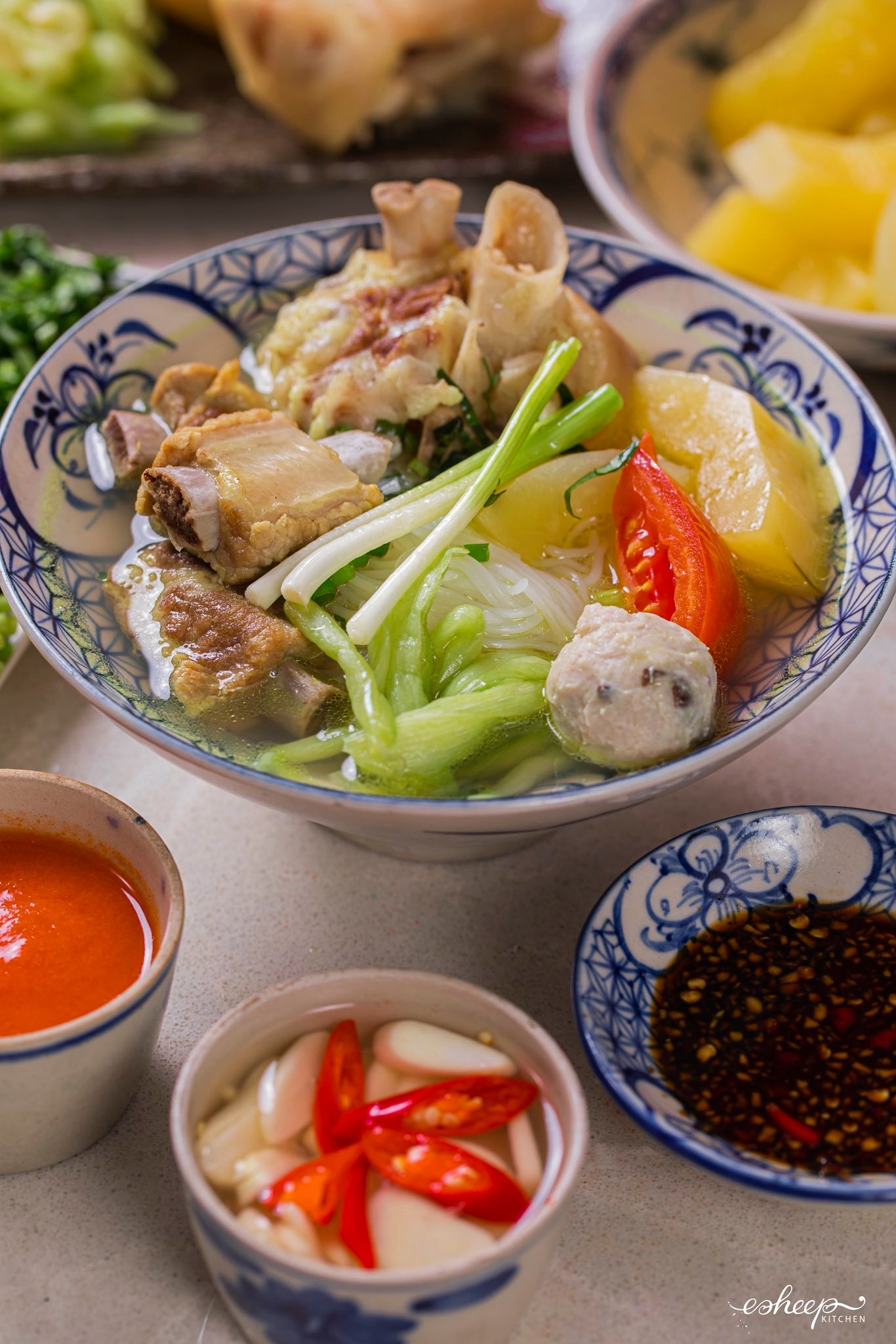 Bún trắng tươi đặt gọn trong lòng bát, rồi lần lượt là sườn, móng giò, đu đủ, dọc mùng, rồi hành hoa, mùi tàu thơm lừng.