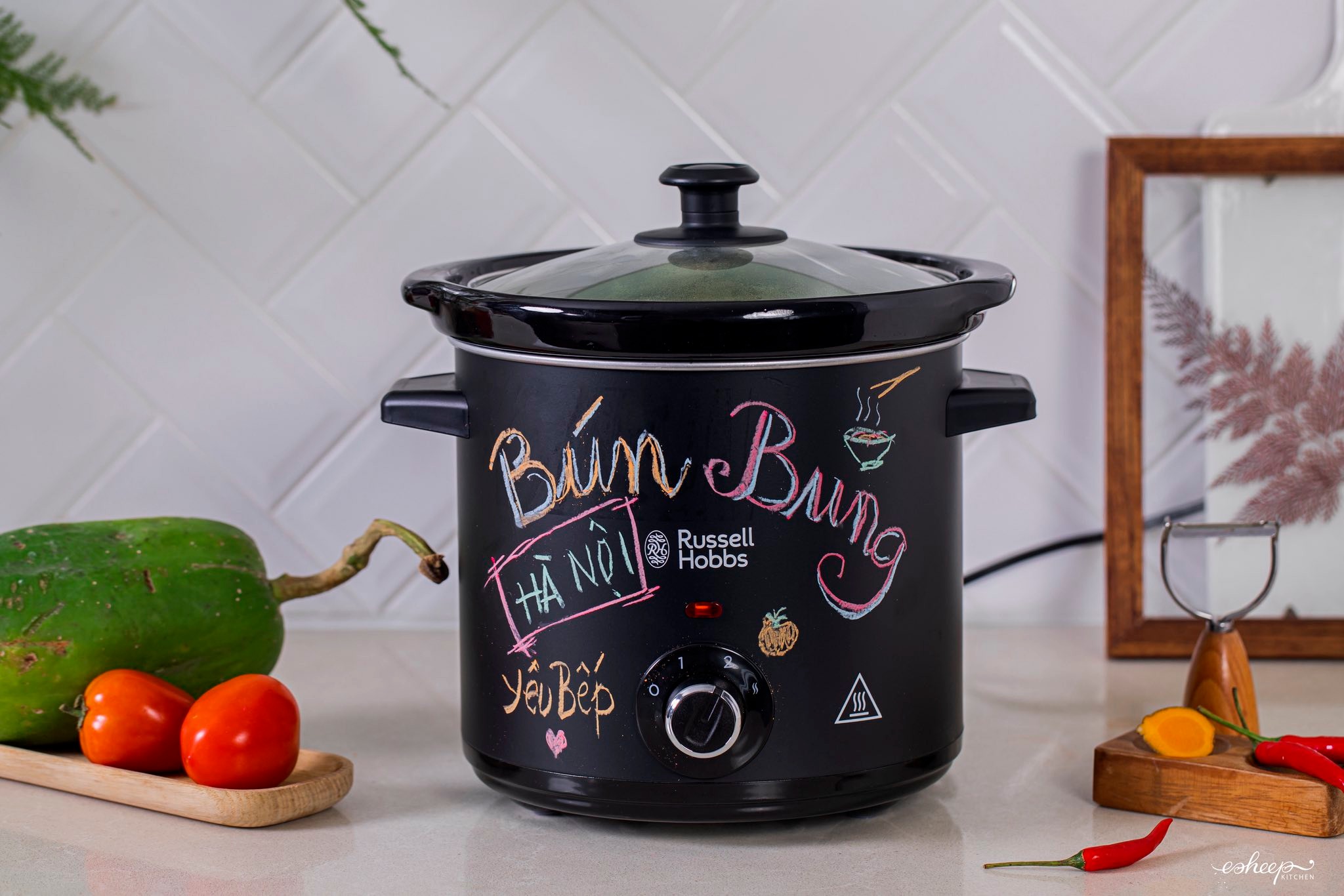 Các loại nồi nấu chậm trước đây, cái lòng nồi nó bé xíu, mình phải gọi là cái thố thì đúng hơn huhu, nấu 1 người ăn 1 bữa, chứ để làm được nồi bún bung như này là chuyện không tưởng. Cho đến khi nhu cầu ăn đồ nấu chậm dần tăng, nhiều loại nồi nấu chậm cỡ lớn ra mắt hàng loạt, nhưng chỉ có một em lọt qua vòng ⅛ để vào thẳng chung kết chính là em Russell Hobb này. Hơn 2 củ khoai, nấu bữa bún bung thôi đã thấy “huề vốn” rồi