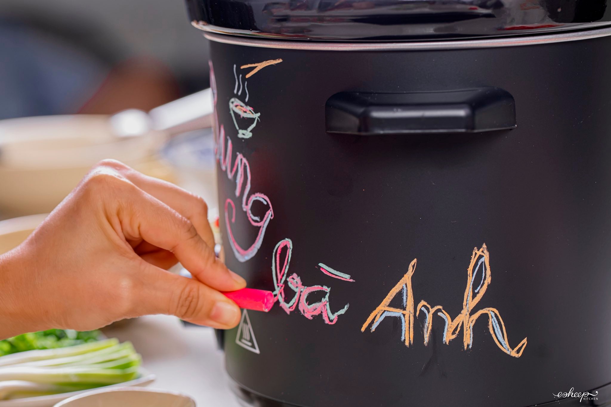 Vì cái nồi nó cho mình làm vậy mà, thân nồi được phủ nhám như một chiếc bảng đen. Lớp sơn nhám này hạn chế bám cặn gia vị, dầu mỡ, dễ vệ sinh và để các bạn có thể dễ dàng dùng phấn viết lời ghi chú, công thức, tên món, lời tỏ tình, đôi câu dằn mặt người ấy… kiểu kiểu vậy