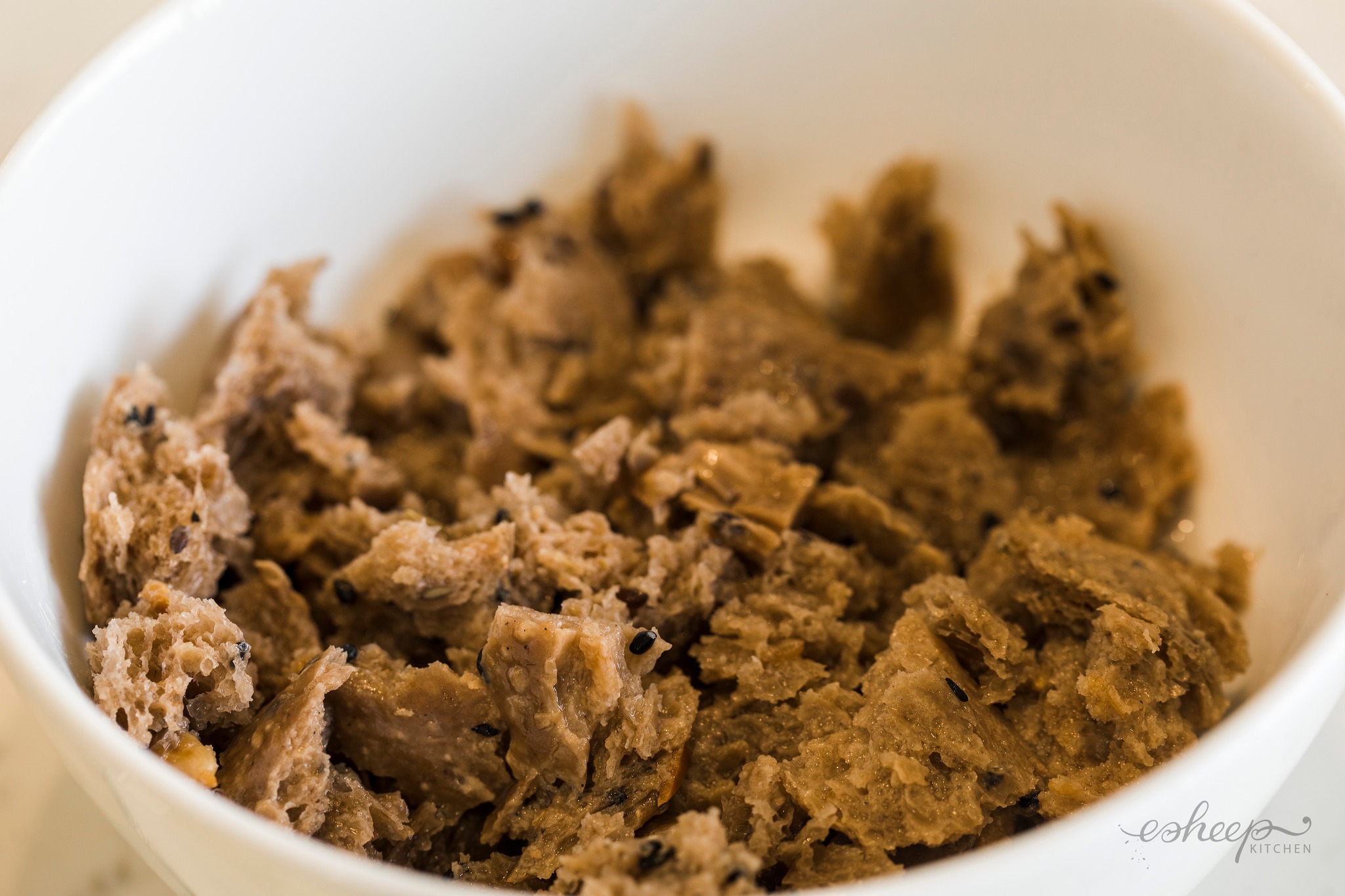 3. Bánh mì đen xé nhỏ, ngâm vào nước luộc hạt điều cho nở mềm.