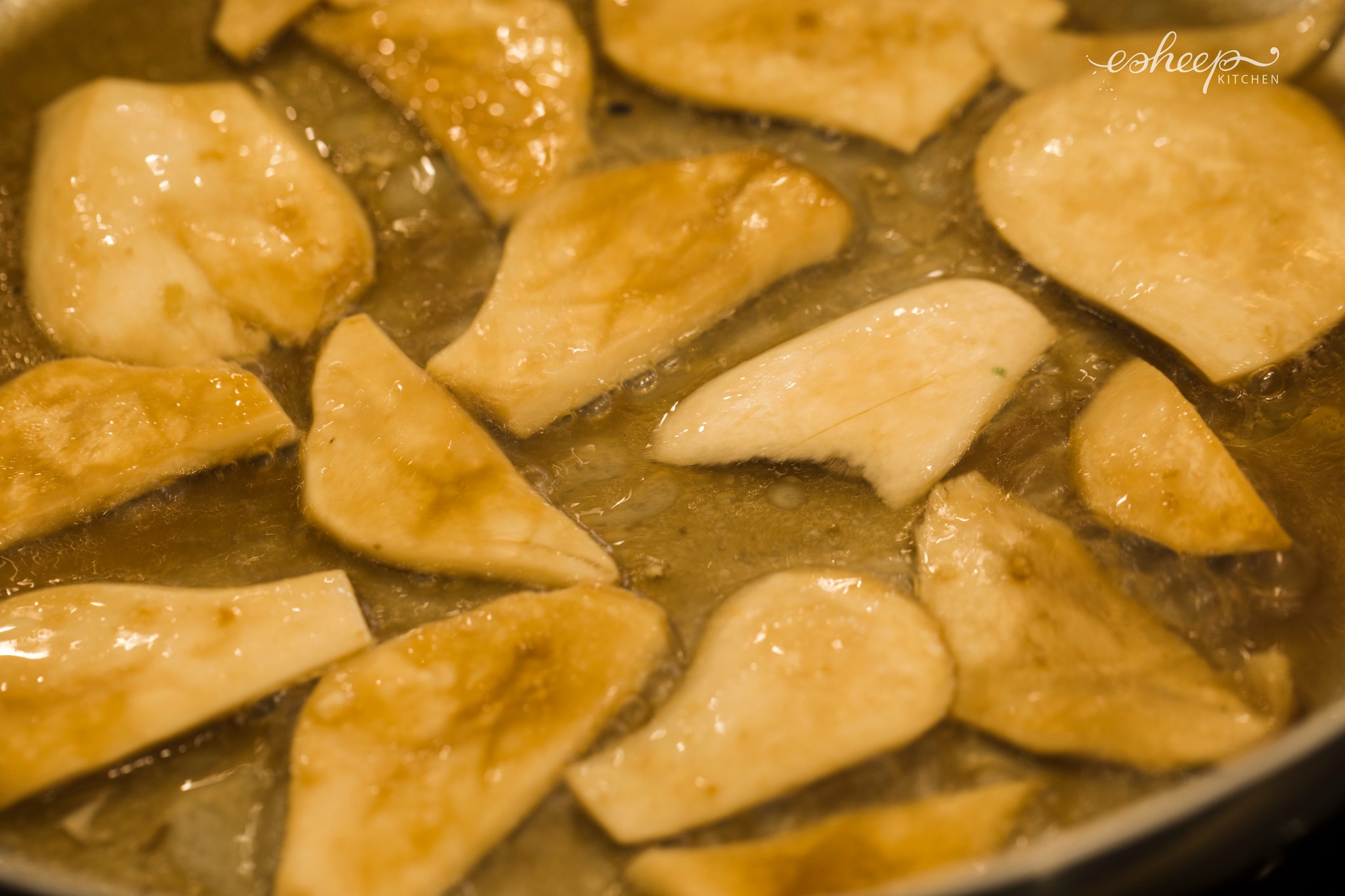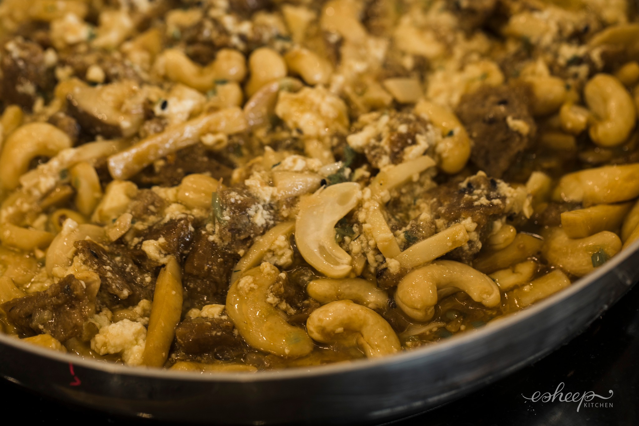 Dùng luôn chảo xào nguyên liệu để áp chảo 100g nấm thái lát cho xém thơm. Pha 1 thìa nhỏ nước tương + 1 thìa to nước luộc hạt điều rồi đổ vào chảo, đậy vung cho nấm chín mềm.