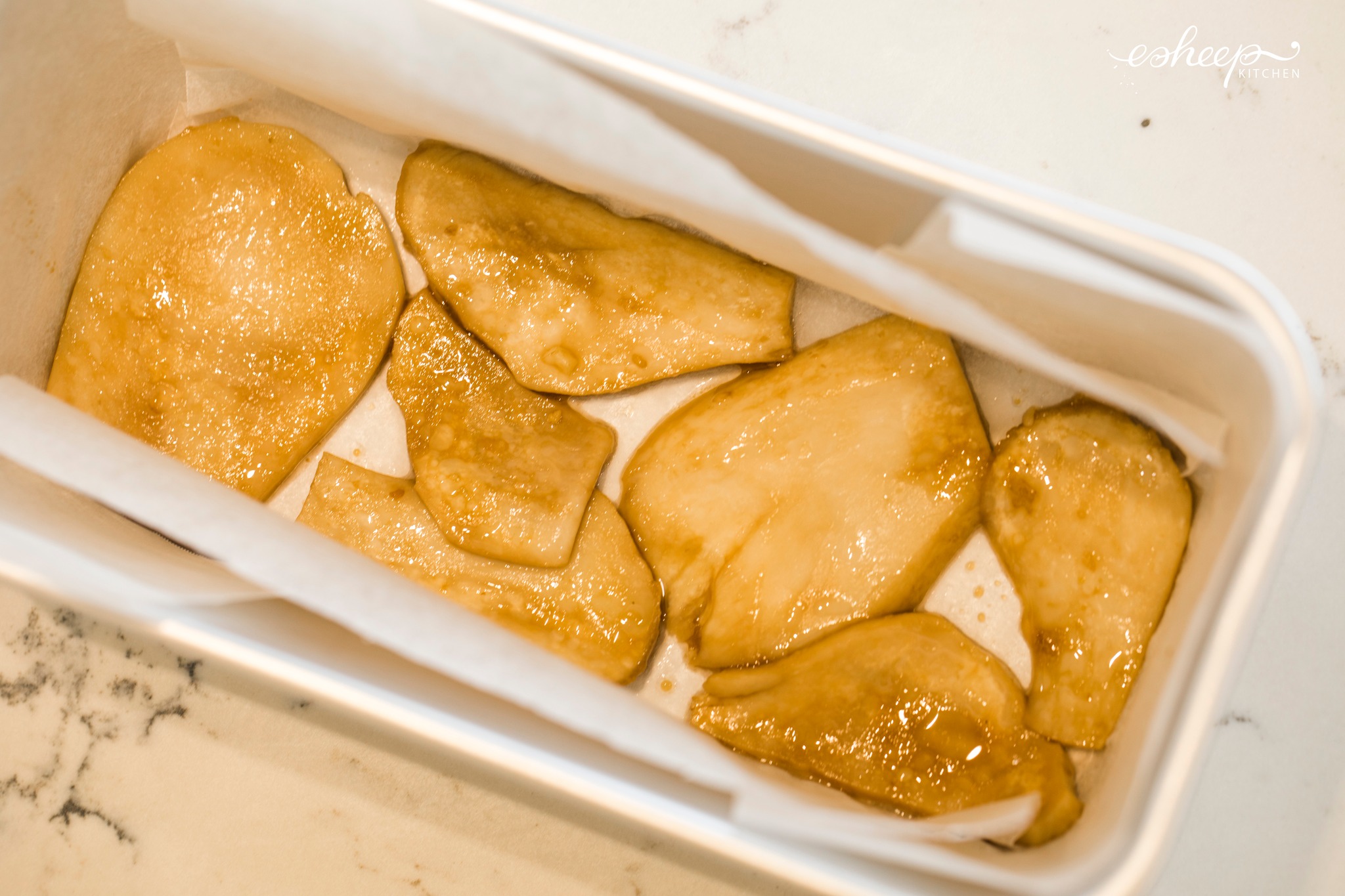 11. Dùng khuôn loaf/ hộp nhựa chữ nhật khoảng 10x18cm, lót giấy nến chống dính rồi lót 1 lớp nấm vừa xào vào khuôn.