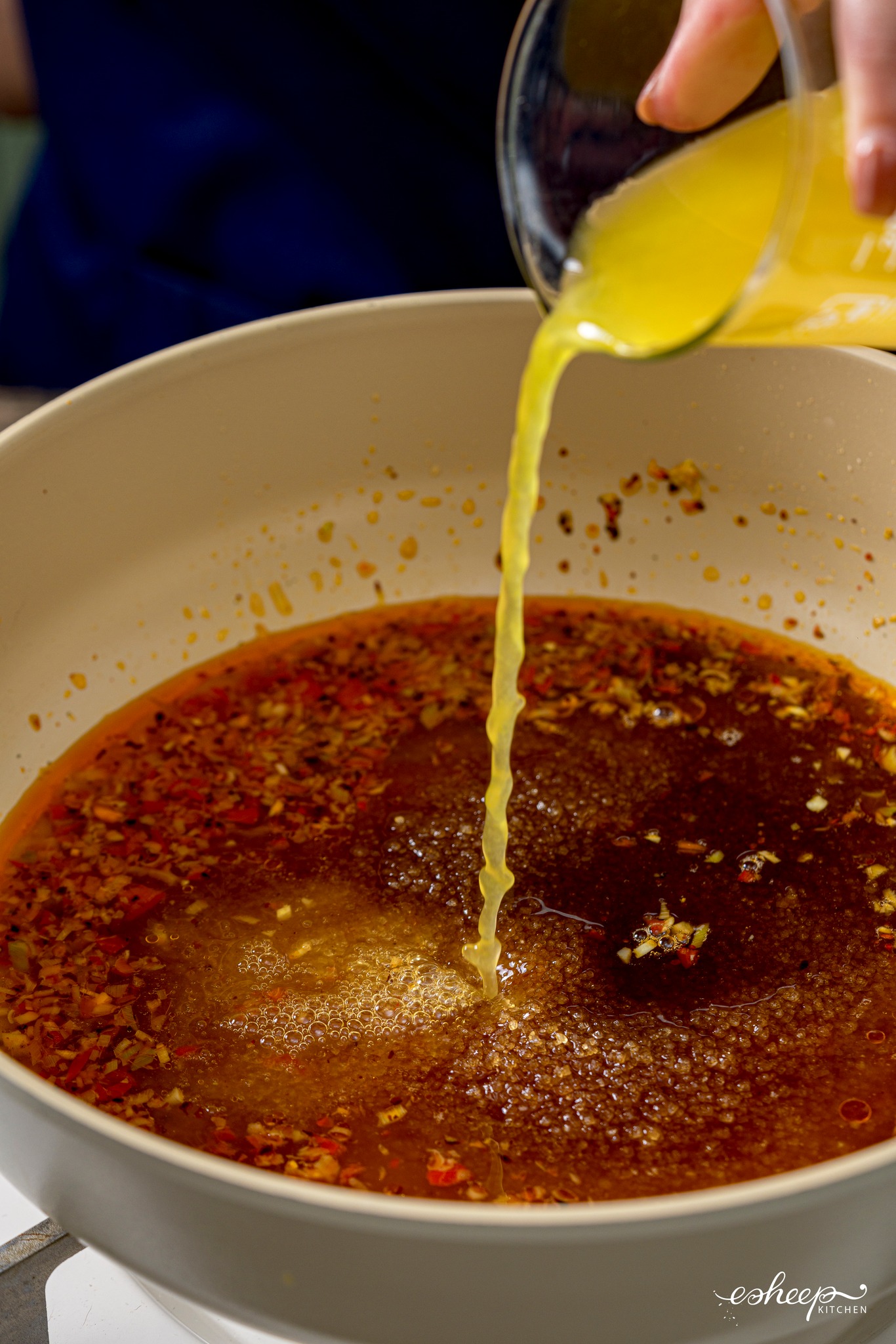 B3. Hạ lửa, rót nước cốt tắc và rim đến khi xốt cạn, sánh nhẹ thì tắt bếp.